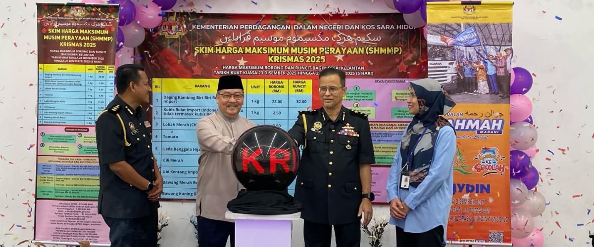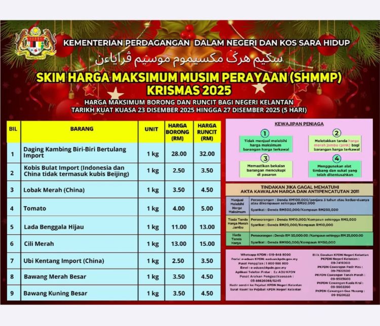 KOTA BHARU, 24 Disember - Kementerian Perdagangan Dalam Negeri dan Kos Sara Hidup (KPDN) Kelantan melancarkan Skim Harga Maksimum Musim Perayaan (SHMMP) Krismas 2025 yang berlangsung selama lima hari bermula 23 hingga 27 Disember ini bagi membantu rakyat mendapatkan barangan keperluan pada harga berpatutan.