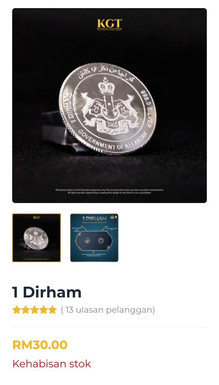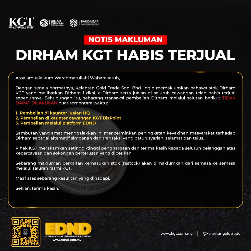 KGT dalam satu kenyataan di laman sosial pada Ahad menyatakan, susulan kehabisan stok tersebut, semua transaksi pembelian Dirham di ibu pejabat (HQ), cawangan KGT BizPoint serta menerusi platform EDND tidak dapat dilakukan buat sementara waktu sehingga dimaklumkan kelak.