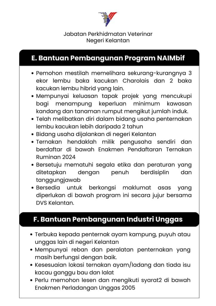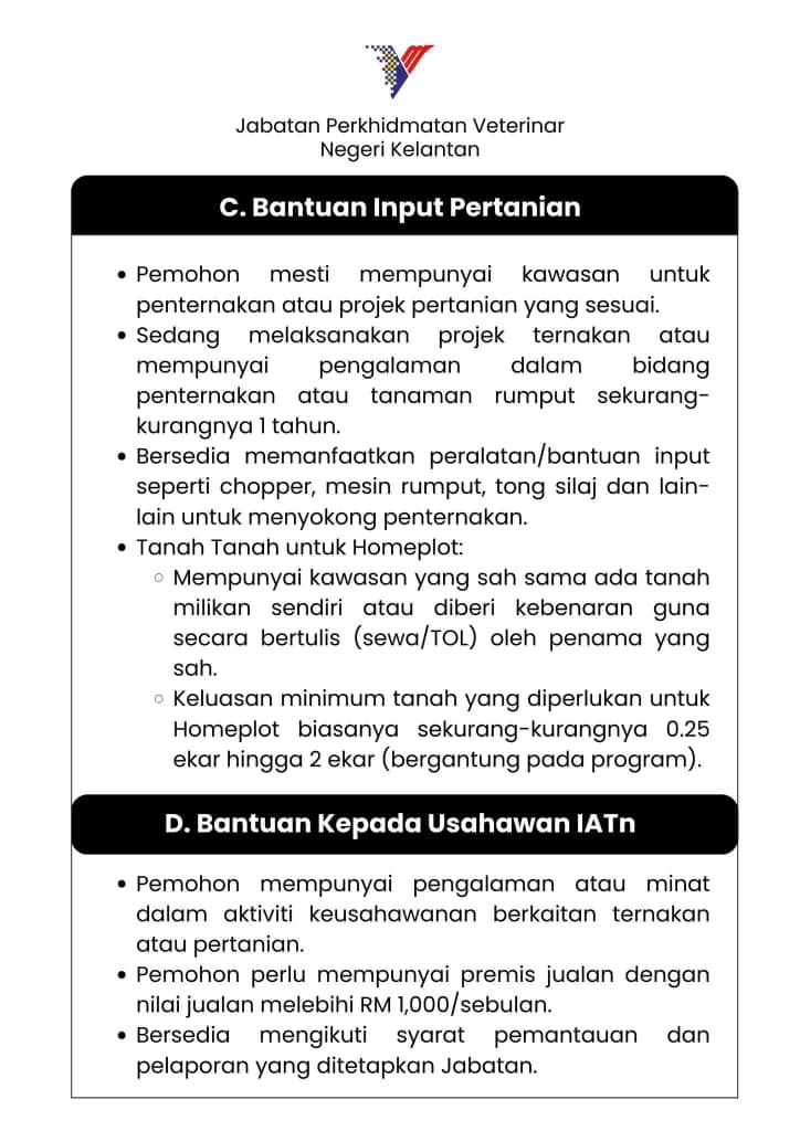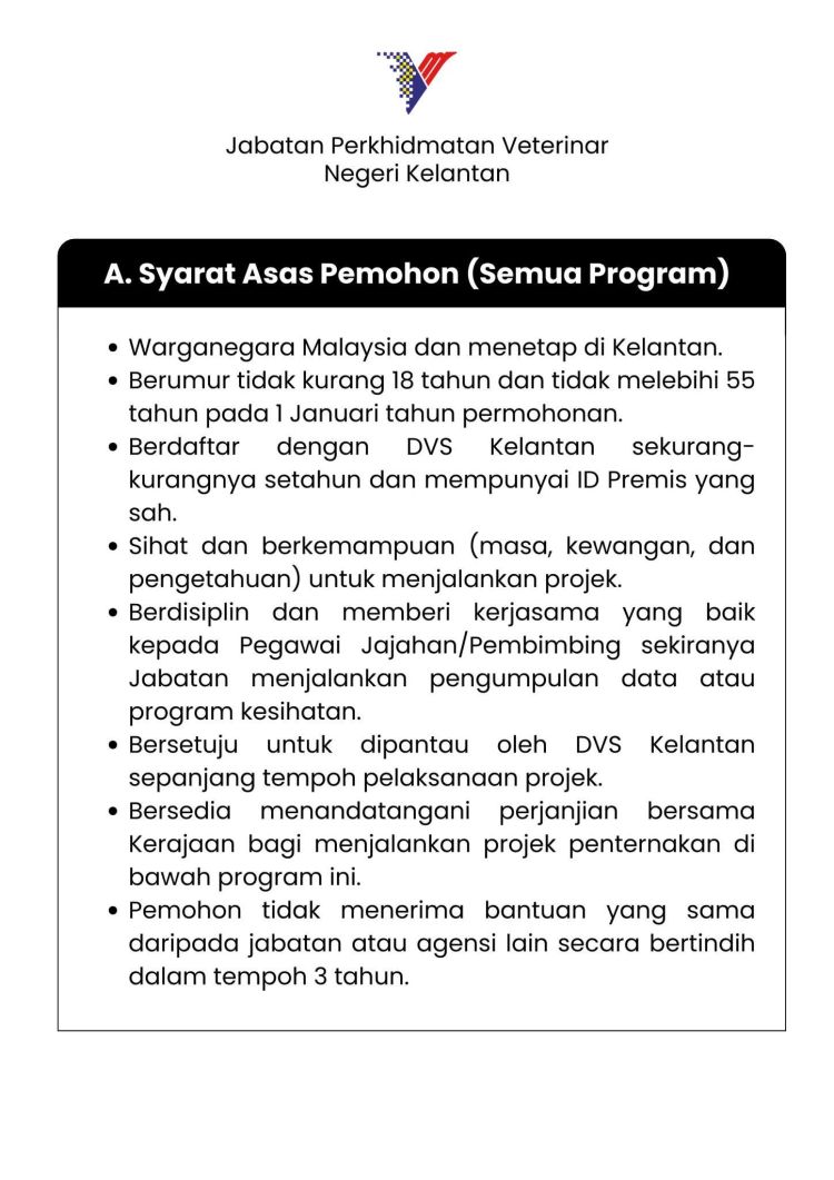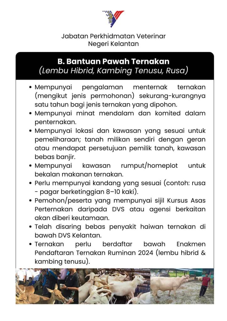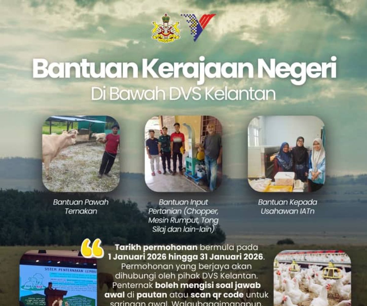 KOTA BHARU, 30 Disember - Jabatan Perkhidmatan Veterinar Negeri Kelantan (DVS Kelantan) mempelawa penternak dan usahawan ternakan yang layak untuk memohon Bantuan Kerajaan Negeri di bawah jabatan itu bagi Tahun 2026. Tempoh permohonan bermula 1 hingga 31 Januari 2026.