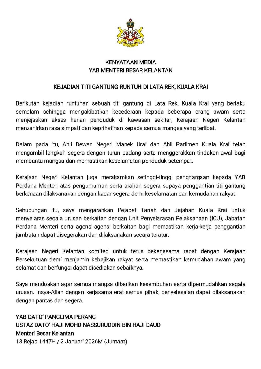 KOTA DARULNAIM, 3 Januari - Kerajaan Negeri Kelantan menzahirkan rasa simpati dan keprihatinan terhadap semua mangsa yang terlibat dalam kejadian runtuhan sebuah titi gantung di Kampung Chatel, Lata Rek, Kuala Krai pada Jumaat lalu.