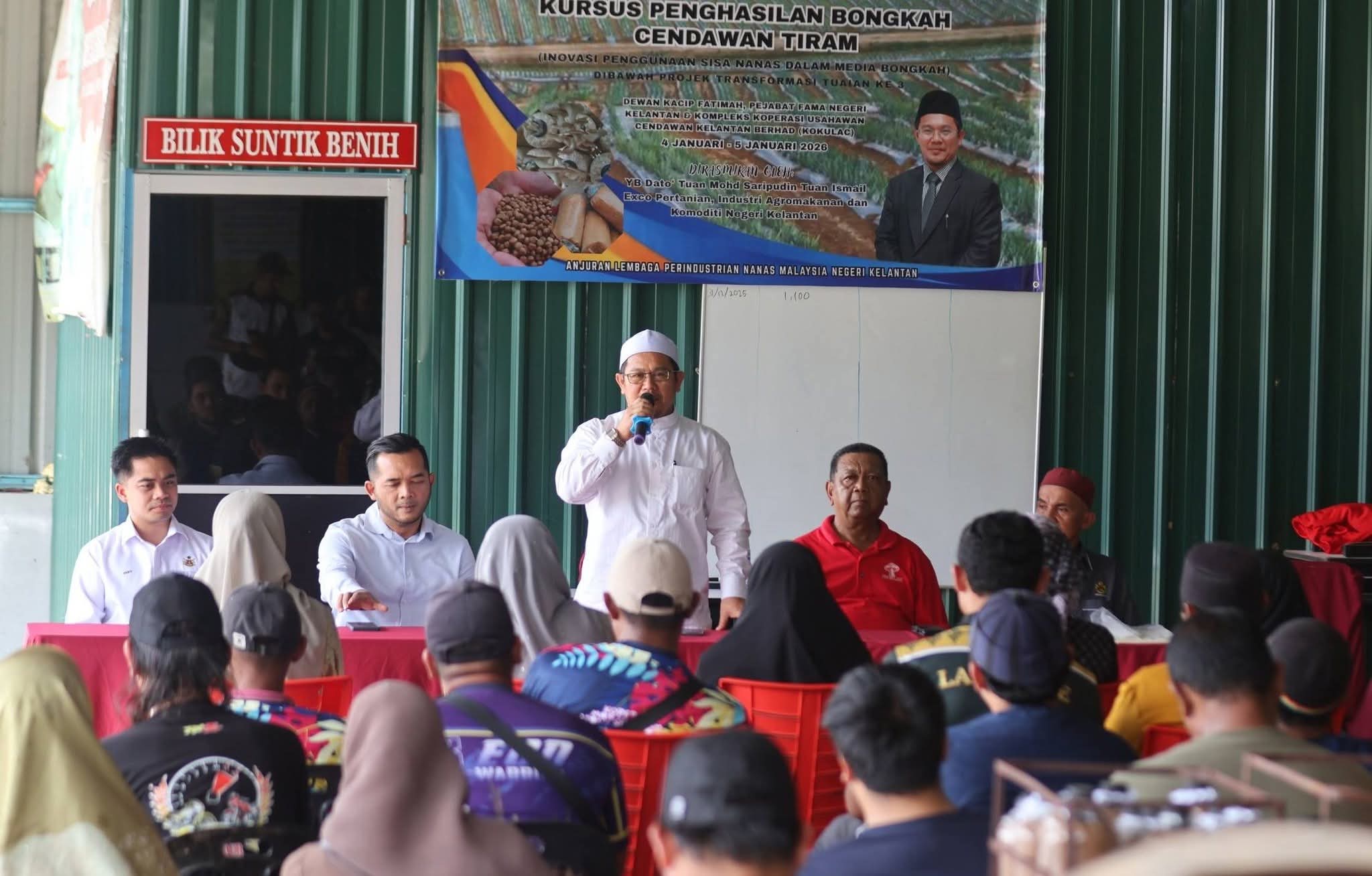 Terdahulu, beliau merasmikan Kursus Penghasilan Bongkah Cendawan Berasaskan Media Sisa Nanas di Kompleks Cendawan Kokulac, Pasir Puteh yang melibatkan sebanyak 40 peserta.