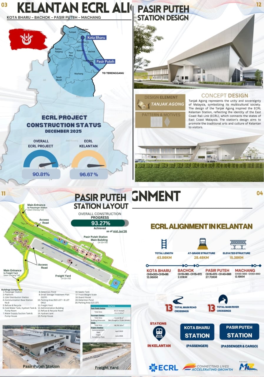 KOTA BHARU, 29 Januari 2026 - Pembinaan jajaran Projek Laluan Rel Pantai Timur (ECRL) sepanjang 43 kilometer di negeri Kelantan telah mencapai tahap kemajuan sebanyak 96.67 peratus sehingga Disember 2025.