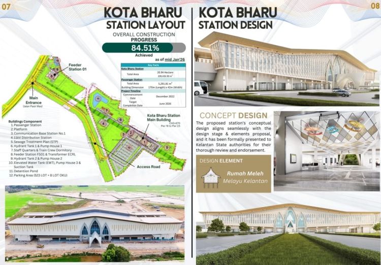 “Stesen Kota Bharu di Tunjong direka berteraskan konsep ‘Rumah Meleh Melayu’ dan elemen ‘Bunga Ketam Guri’ bagi mengekalkan keunikan seni bina serta warisan budaya Kelantan, di samping menyediakan kemudahan moden dan selesa kepada pengguna,” ujarnya.