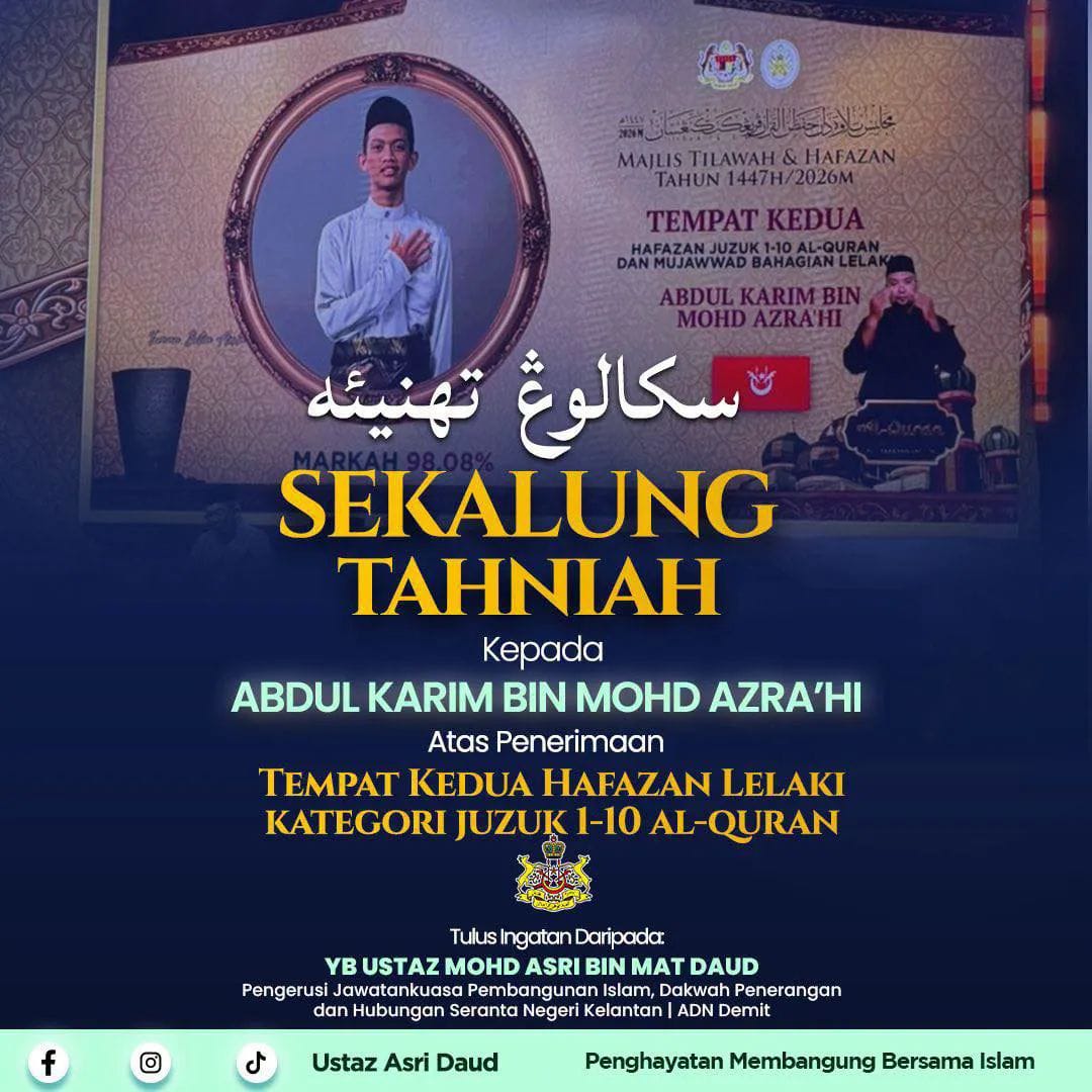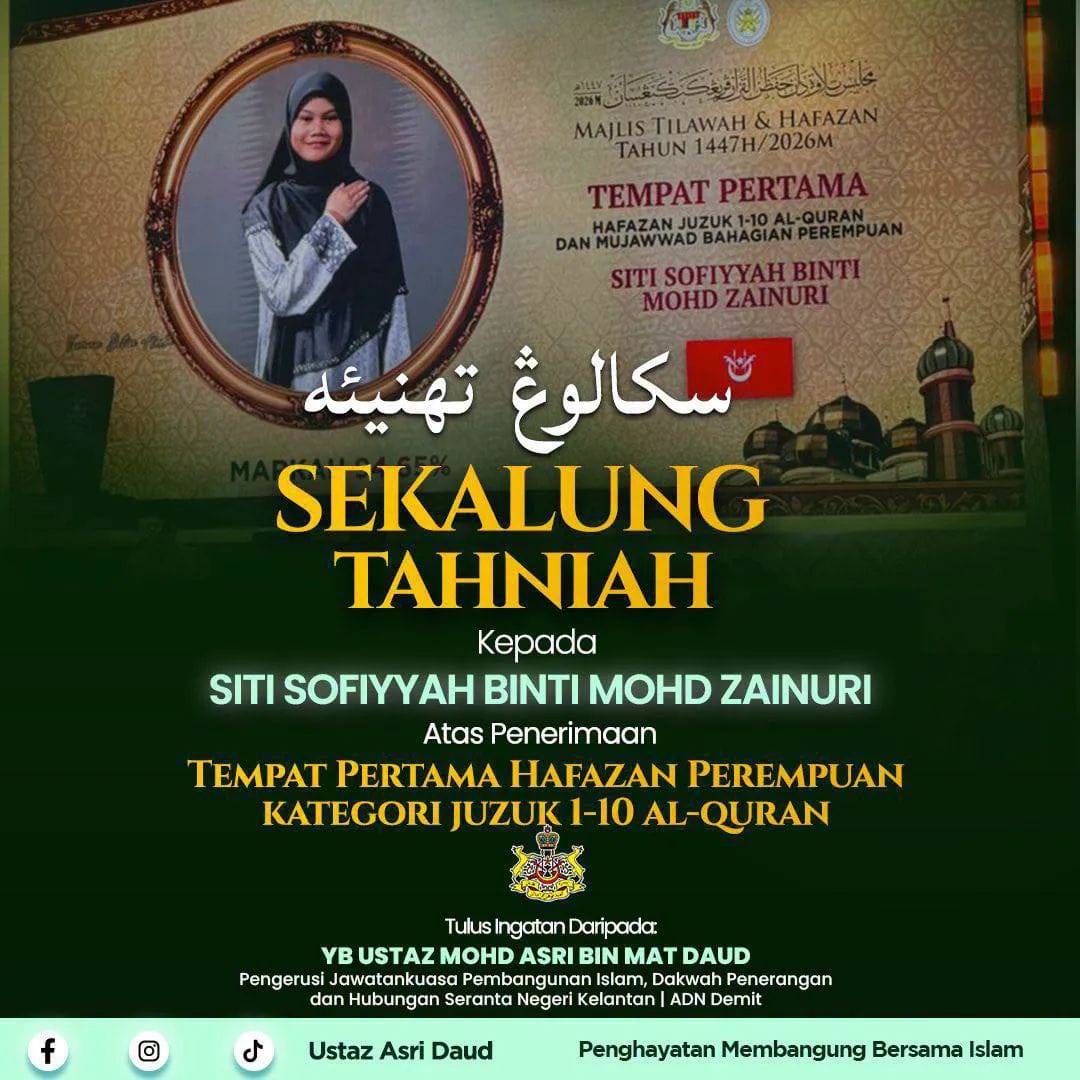 “Setinggi-tinggi tahniah diucapkan kepada kedua-dua peserta atas kejayaan ini. Ia bukan sahaja membanggakan Kelantan, malah menjadi inspirasi kepada anak-anak muda untuk terus mendekati dan menghayati Al-Quran,” katanya menerusi kenyataan di laman rasmi, semalam.