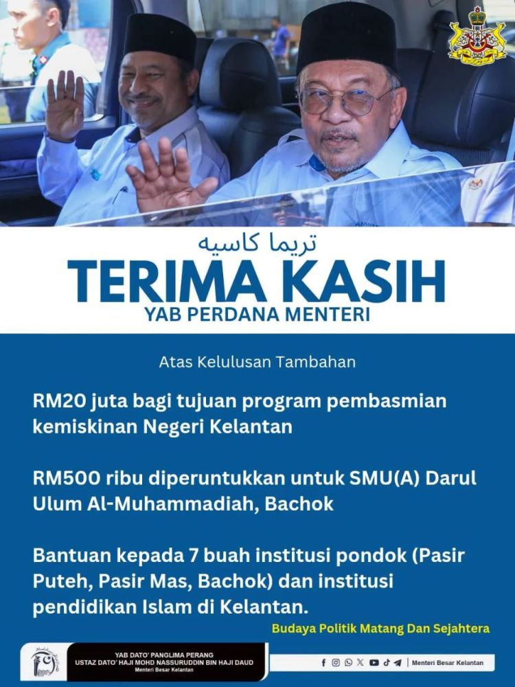 “Atas peruntukan yang diumumkan, saya merakamkan penghargaan dan Kelantan amat mengalu-alukannya demi kelangsungan dan kesejahteraan rakyat,” katanya.