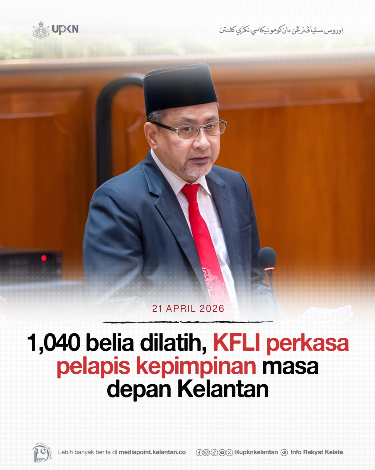 KOTA DARULNAIM, 21 April — Sebanyak 1,040 belia berjaya dilatih bermula Januari 2025 hingga Mac 2026 menerusi Kelantan Future Leaders Institute (KFLI) sebagai usaha berterusan Kerajaan Negeri Kelantan dalam memperkasa pelapis kepimpinan masa depan yang berilmu, berakhlak dan berwawasan.