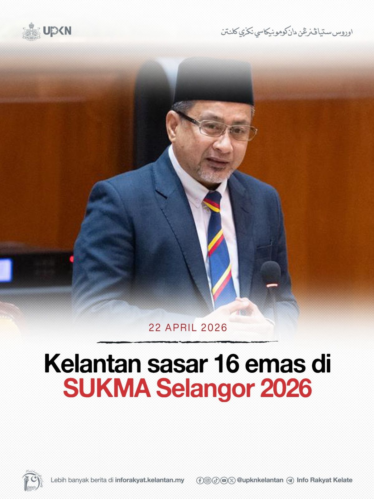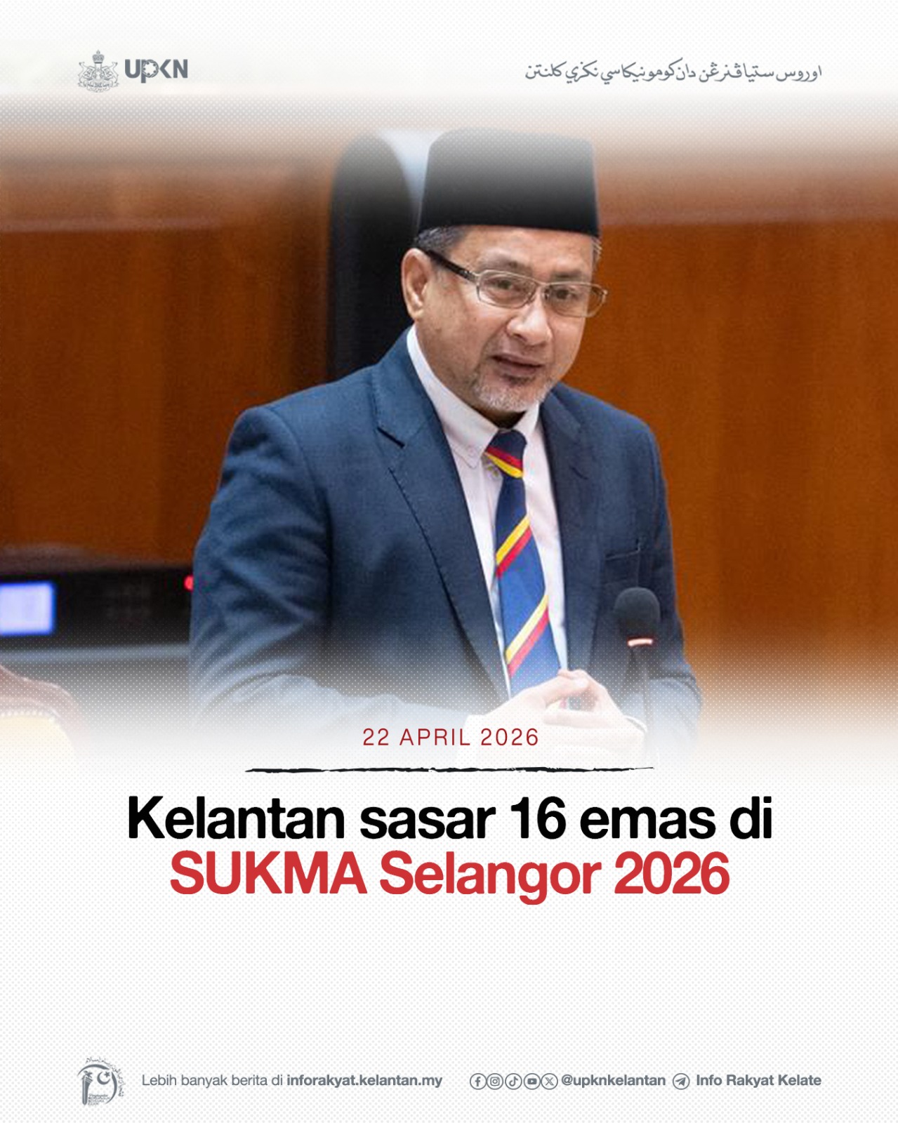 KOTA DARULNAIM, 22 April – Kerajaan Negeri Kelantan meletakkan sasaran untuk meraih 16 pingat emas pada temasya Sukan Malaysia (SUKMA) XXII Selangor 2026 sebagai usaha memperkasa pencapaian sukan negeri di peringkat kebangsaan.