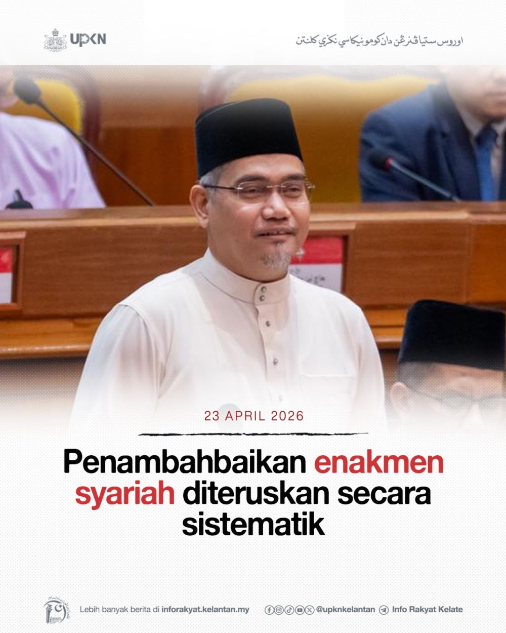 KOTA DARULNAIM, 23 April — Kerajaan Negeri Kelantan terus memperkukuh kerangka perundangan Islam apabila beberapa enakmen utama kini berada dalam fasa penelitian, pemurnian serta pelaksanaan secara berperingkat, sekali gus memperlihatkan komitmen berterusan dalam memartabatkan sistem perundangan syariah negeri.