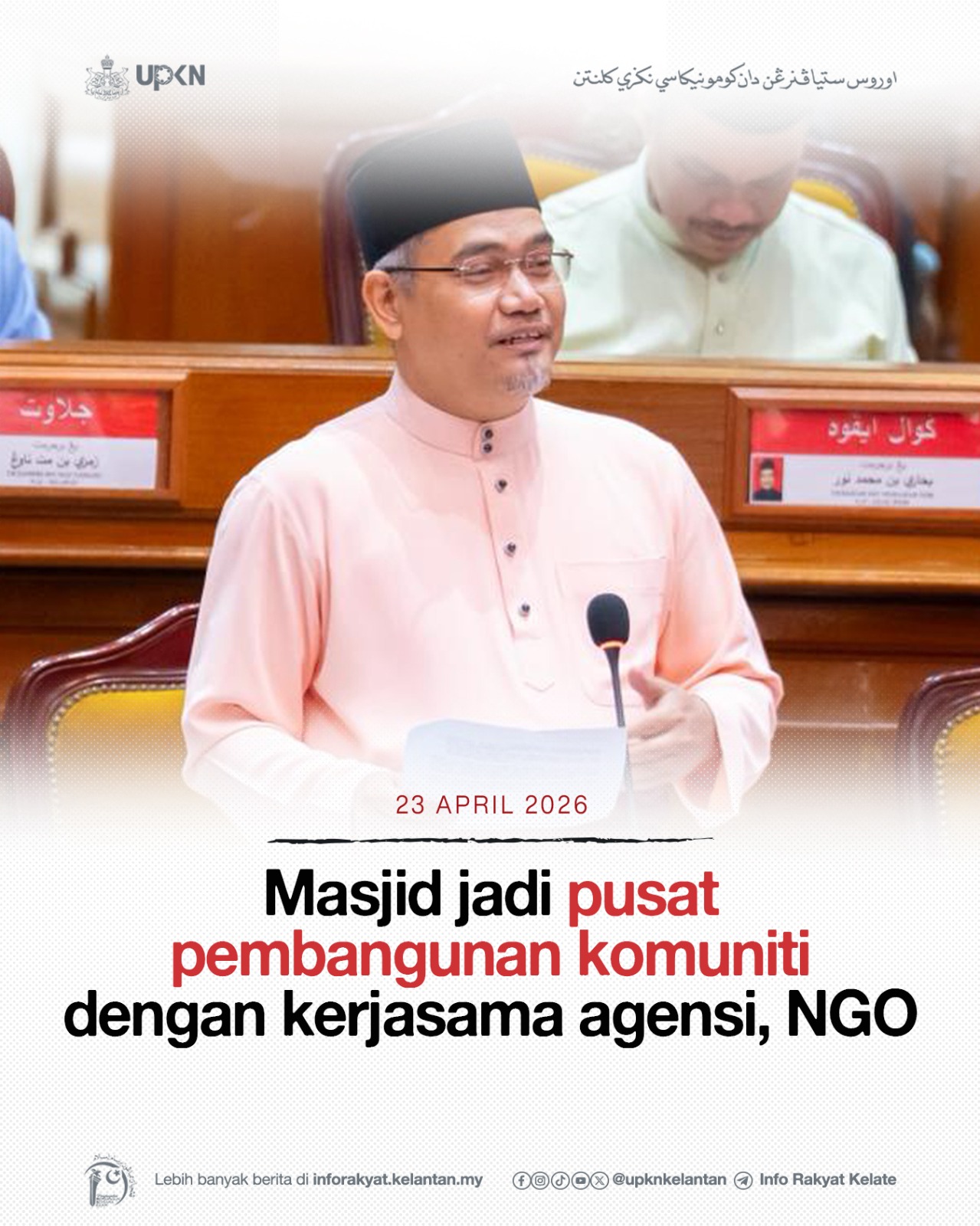 KOTA DARULNAIM, 23 April – Kerajaan Negeri Kelantan terus mempertingkat peranan masjid sebagai pusat pembangunan komuniti melalui kerjasama bersepadu bersama pelbagai agensi pembangunan Islam serta pertubuhan bukan kerajaan (NGO) di seluruh negeri Kelantan.