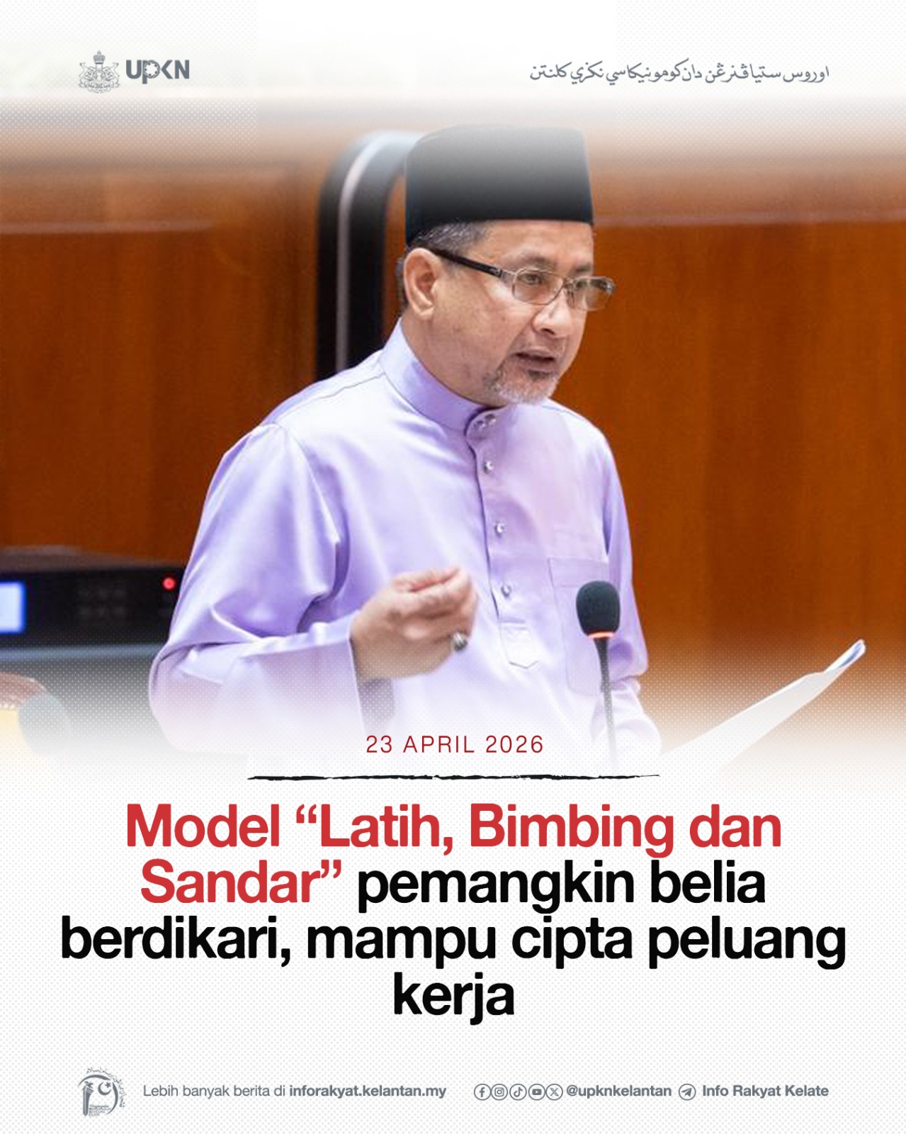 KOTA DARULNAIM, 23 April — Kerajaan Negeri Kelantan memperkenalkan model pembangunan belia berteraskan konsep “Latih, Bimbing dan Sandar” yang merangkumi tiga fasa utama iaitu latihan kemahiran, bimbingan berterusan serta laluan ke arah berdikari bagi melahirkan belia berdaya saing dan mampu mencipta peluang pekerjaan.