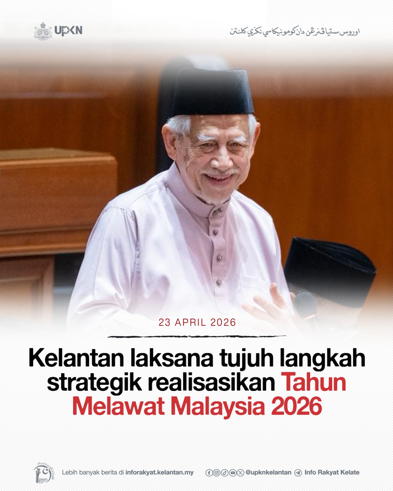 KOTA DARULNAIM, 23 April 2026 – Tujuh langkah strategik digerakkan Kerajaan Negeri Kelantan bagi merealisasikan Tahun Melawat Malaysia 2026 (TMM2026) sekali gus memperkukuh daya saing sektor pelancongan negeri di peringkat domestik dan antarabangsa.