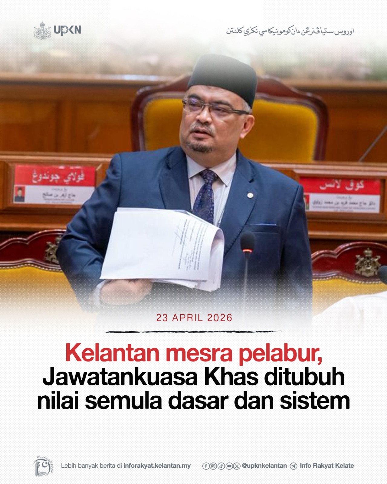 KOTA DARULNAIM, 23 April — Kerajaan Negeri Kelantan menubuhkan jawatankuasa khas bagi menilai semula sistem dan dasar pelaburan secara menyeluruh, sekali gus memperkukuh kedudukan negeri ini sebagai destinasi mesra pelabur.