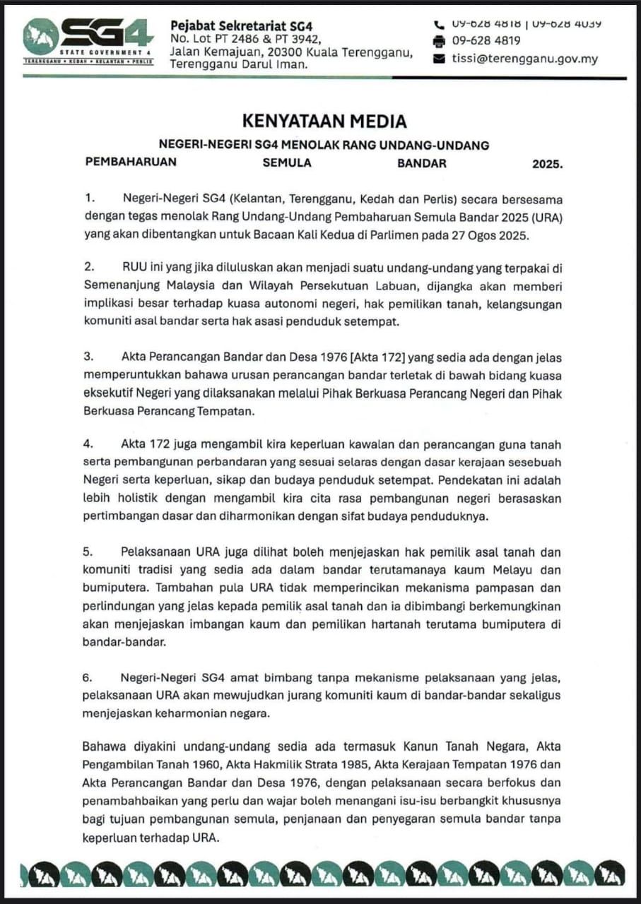 “Oleh yang demikian, negeri-negeri SG4 menolak RUU Pembaharuan Semula Bandar 2025,” tegas kenyataan itu.